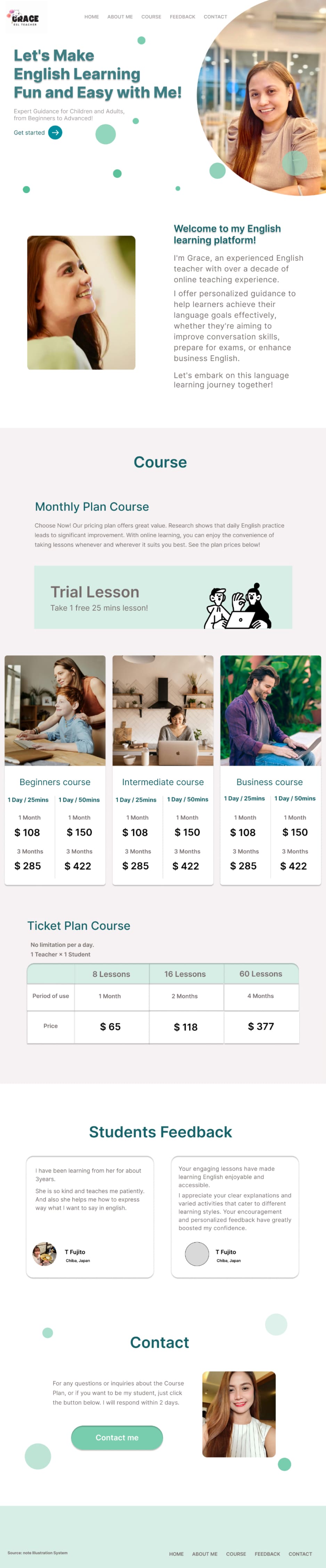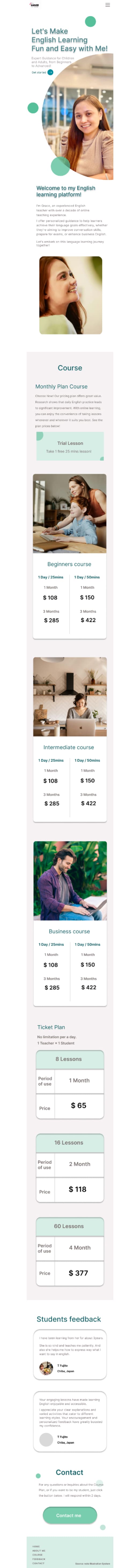 クライアントワークで友人でもあるフィリピン人の方の英会話スクールの生徒募集のサイトを制作しました。 クライアントから薄緑のカラーと爽やかな雰囲気で作って欲しいと要望がありデザインしました。 サイトへ訪問して下さったユーザー様へ、教師への信頼感とレッスンの雰囲気を伝えるために教師自身の写真を中心に使用しました。